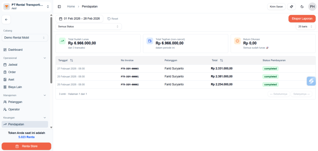 Anda bisa melihat secara instan berapa total dana bersih yang sudah masuk ke kantong. Ini membantu Anda merencanakan biaya operasional seperti servis unit atau gaji karyawan dengan lebih pasti.