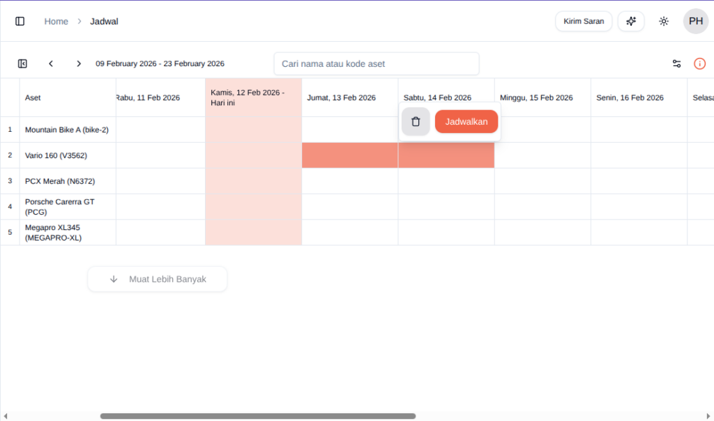 Langkah pertama dimulai dari halaman Jadwal. Di sini, Anda akan melihat kalender interaktif yang menampilkan daftar aset Anda di sisi kiri.